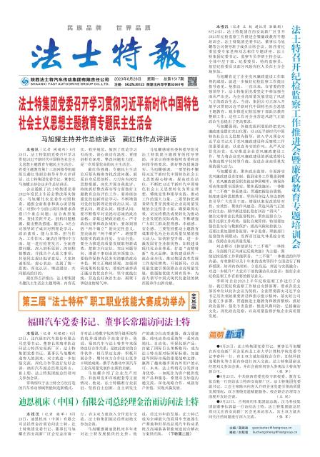 點擊量:2231● 法士特集團黨委書記 董事長 馬旭耀 全體員工、家屬同志們:金風送爽迎佳節,大地歡歌贊盛世。值此國慶七十四周年、法士特集團建廠五十五周年、法士特齒輪有限公司成立二