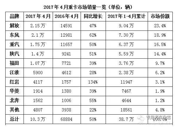 點擊量:15294月重卡同比增5成 5月會是拐點嗎?還記得在2016年底,不少業內人士分析2017年重卡銷量走勢時指出,2017年重卡的火爆形勢會終結在一季度,從4月份開始下滑。事實情況如何呢?據相關機構統計的數據,今年4月,國內重卡市場銷售各類車輛共計約10.3萬輛,比去年同期的6.89萬輛大幅增長50%,環比下降10%。4月銷量同比增長50% 解...